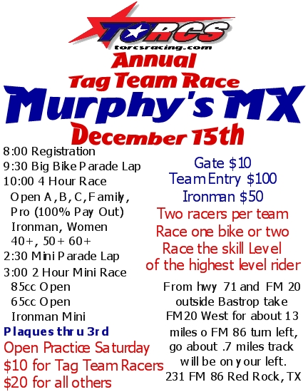 EnterpriseKTMKawasakiHusqvarna Gas GasTJ's CyclesWildwest HondaCycle Shack NorthBig Country MotorsportsFMFFly RacingTroy Lee DesignsFoxMX FactoryRocky Mountain Race GasKent Power SportsCOR Moto GraphicsVP Racing FuelsGraphic Guys812 Suspension100%BMG Xtreme SportsOIff-Road Vixens