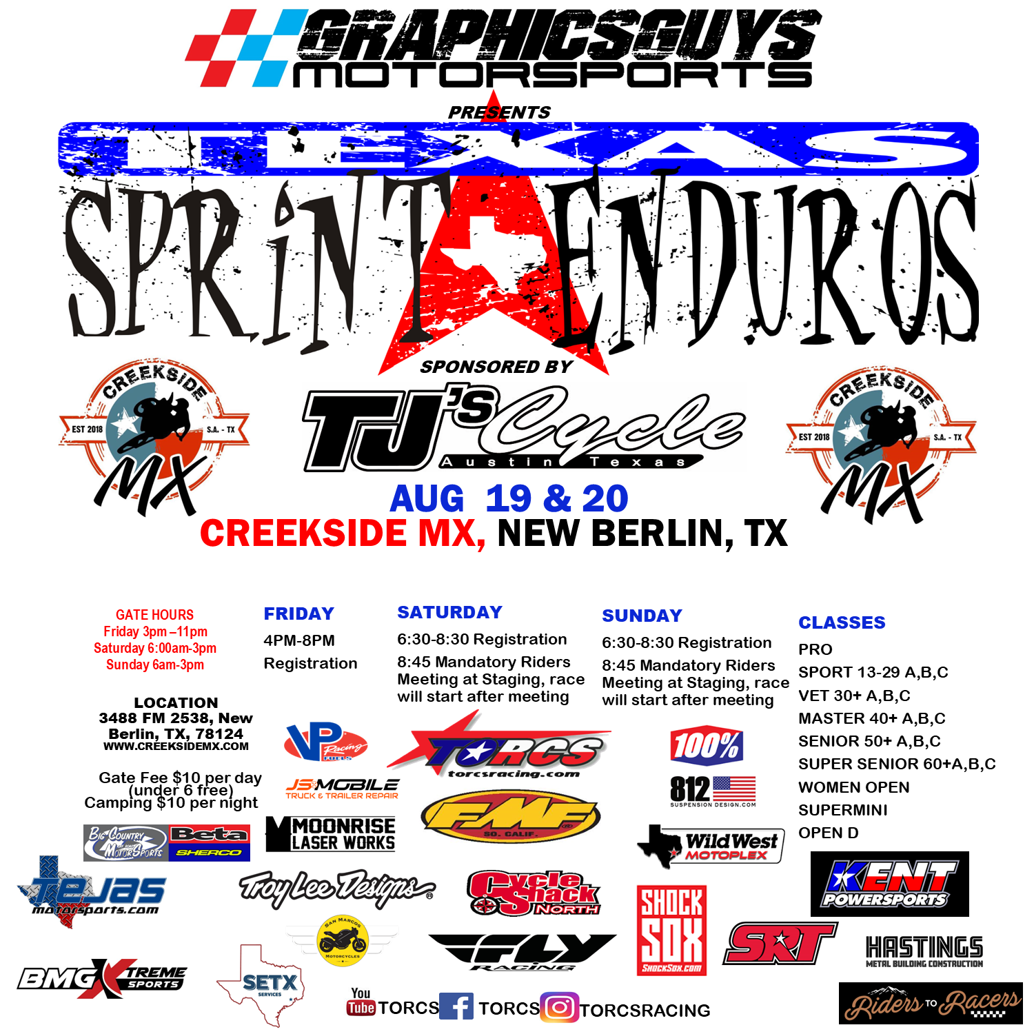 Two days of Sprint Enduro Racing. Race one day or both. One Cross Test and one Enduro Test each day. Racers will make four attempts on each test. The total cumulative time from each test will be used for race results. The rider with the fastest cumulative time from the 8 test wins.